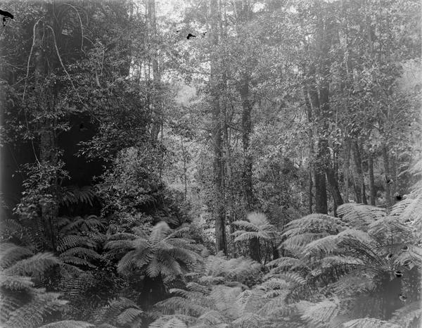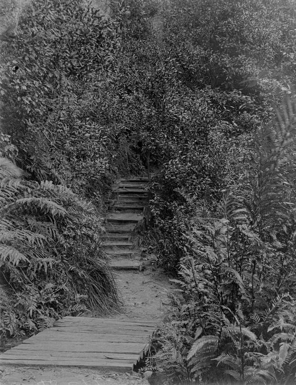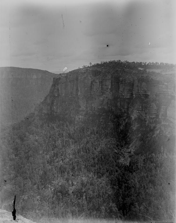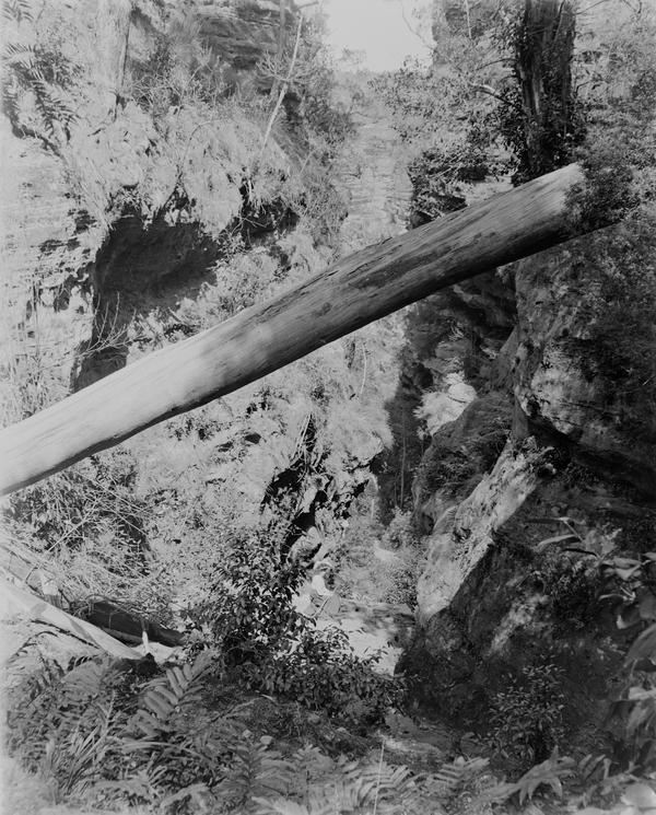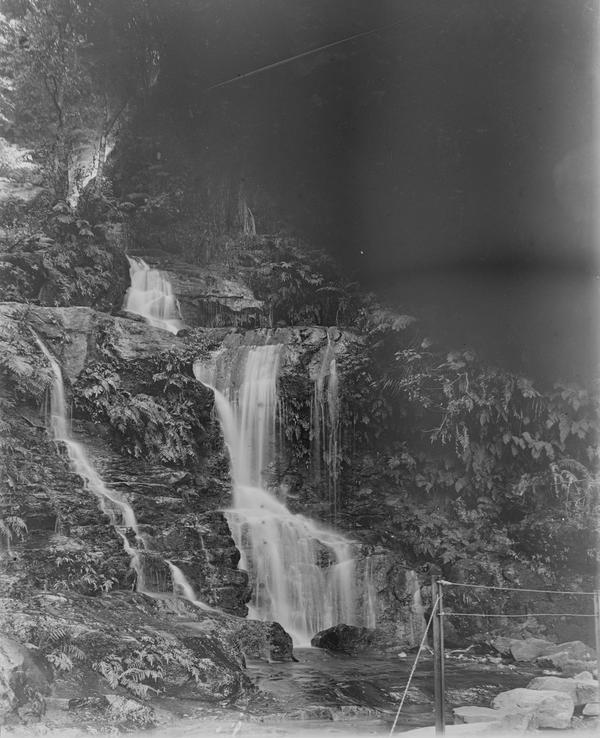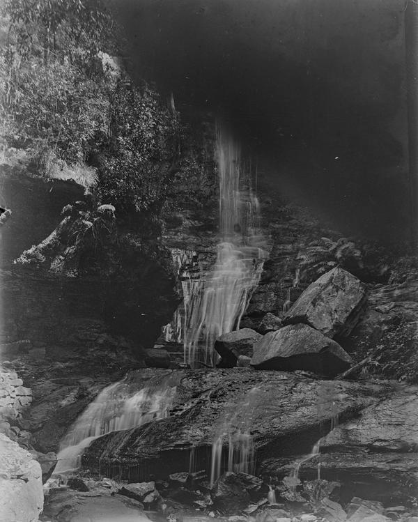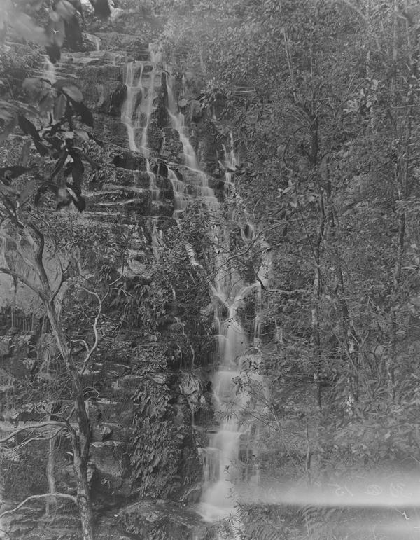The photographer wrote "Sylvia Falls" on the emulsion side of this plate. The waterfalls in the Valley of the Waters in Blue Mountains were frequently photographed in the 1900s and still are today. See, for example, this photograph taken in the 1900s. It is also labelled Sylvia Falls, Leura. Jim Smith in his book "Blue Mountains Photographer Walter Rumble" includes a photograph of Lodore Falls that looks identical. The two waterfalls are just 50 metres from each other, so they could be easily confused. There used to be a track to the base of Lodore Falls in the 1900s where a lot of photographs were taken. Unfortunately, this place is no longer accessible unless you are keen enough to climb wet rocks.