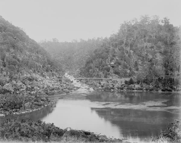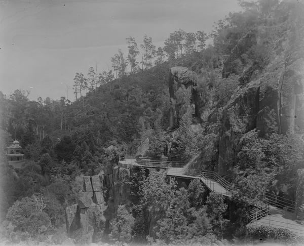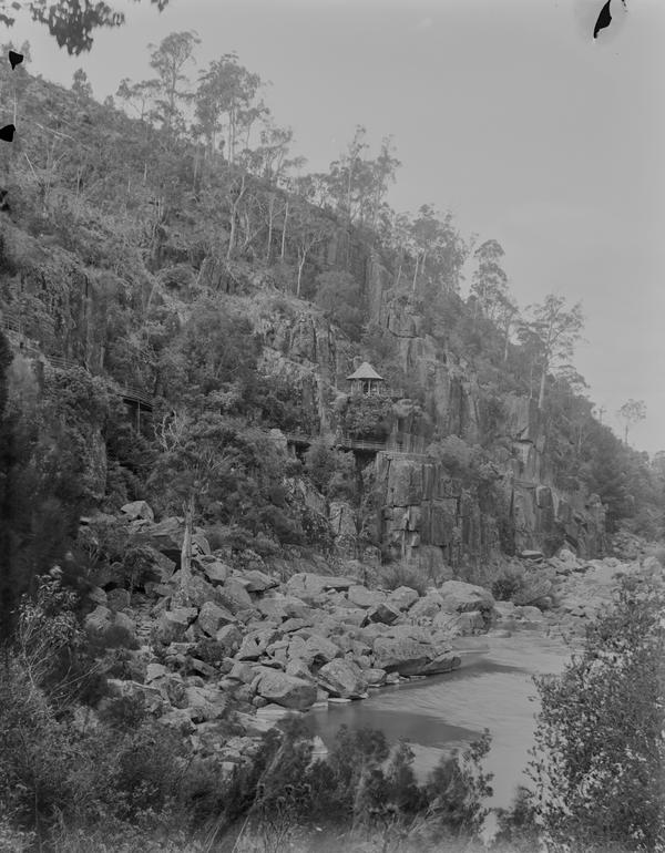 Alexandra Suspension Bridge in the Cataract Gorge was opened to the public on 29 November 1904. It is seen on this image and just barely visible in the background of another photograph.