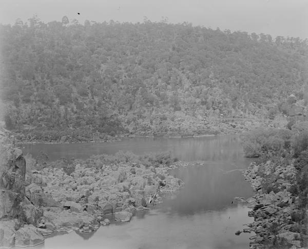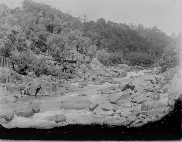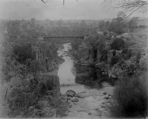 Corra Linn was a popular site for tourists visiting Launceston. The iron bridge over the North Esk River in this photograph was opened in December 1888 and replaced the old wooden structure built in 1857.
