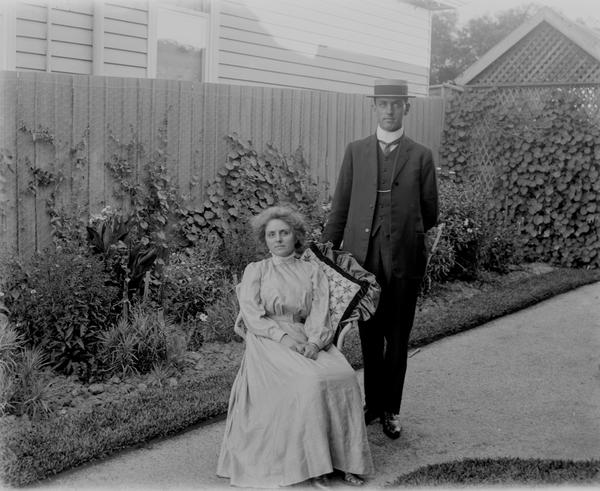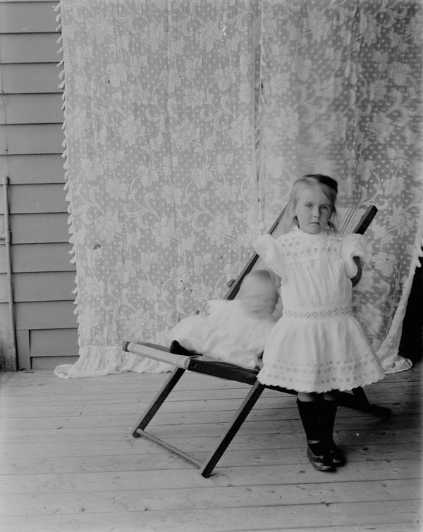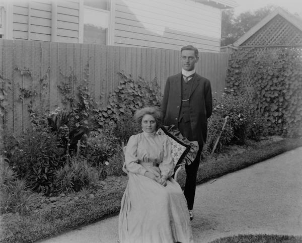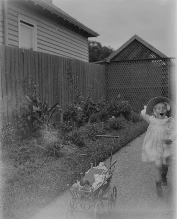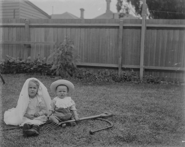 There are two photographs of a couple taken in the backyard of a suburban house. This must be Ada and P. Wilson mentioned in the notes. A photo of Jean with a toy pram is taken from the same spot. So this young lady must be Jean, and the boy next to her on this photograph would be Ronald. The kids also appear on another image Jean wearing her best dress and Ronald trying to sit still in a folding chair.