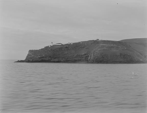 The photograph of the cliff with the lighthouse was most likely taken from a ship near Taiaroa Head (Otago Peninsula). This historical photograph published by Otago Daily Times helped in identifying the lighthouse. The shed with "a sort of jib or crane some 20ft high" as described by The Evening Star is an old fog station. Initially, it used dynamite cartridges to generate acoustic signals to warn ships in heavy fog conditions. A new electric-powered fog station was build in late 1930s and remained operational until the end of 1987. The same article in Otago Daily Times mentions that the fog signal was controlled from "the signal station at the top of the hill". It could be located in the house we see on the photograph which no longer exists.