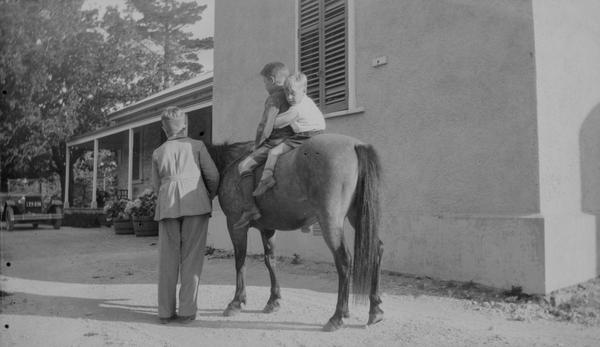This envelope contained 6 negatives likely from the same roll of 116 or 616 type film. The handwriting in pencil is hard to read. The first word might be Wildash a family name (and also a toponym in Queensland). So the first line could be "Wildash + children". Is it Mr. Wildash posing with the children and a horse? There are two photographs of older boys playing golf. Lance and John?