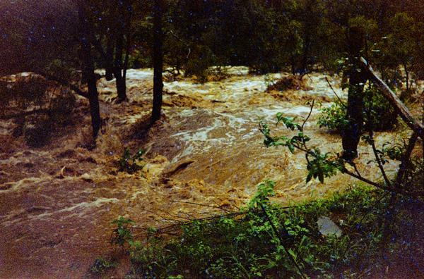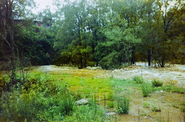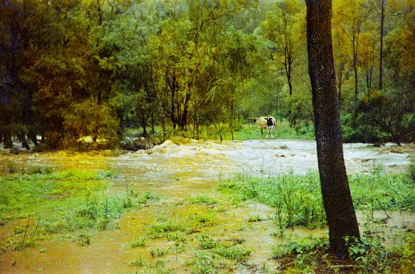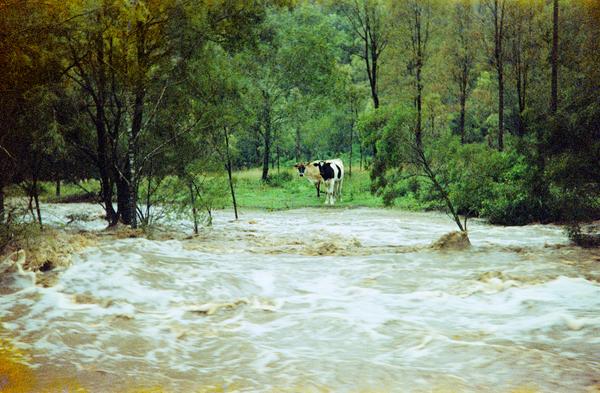 This film (200-5) was produced in the late 1990s for only several years before it was replaced by Gold 200-6 around 1997, and then the current version 200-7 in 2004. Only 6 frames were exposed. It looks like the film was not advanced far enough after loading it into the camera, and the first frame was partially fogged. The photographer must have been in a hurry to capture the flood. I hope the cows safely got home after the water dropped.