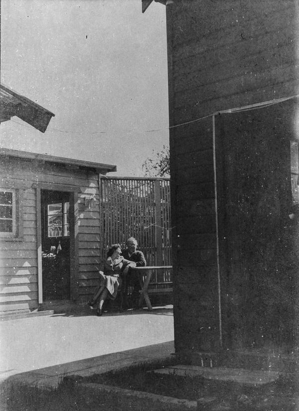 The shots were taken from the same spot and include quite a bit of architecture. Was this intentional? Is it possible that the people on the photographs had just bought the house and wanted it to appear in the images? Or maybe the photographer was unfamiliar with the camera and put the subjects well in the centre of the frame as a precaution. The images are somewhat soft and it is not clear if this was a focusing error, an unsharp lens on a simple camera or natural degradation of the emulsion during 6 or 7 decades of storage.