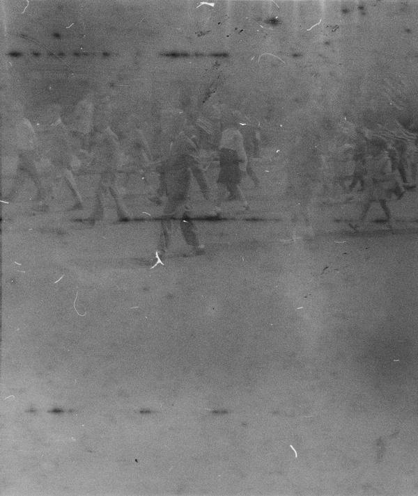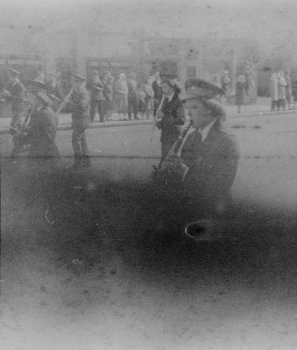 The film was developed in Barry Thornton's two bath developer for 4.5 minutes in bath A and 4.5 minutes in bath B at 20 °C. Fifteen 3x4 cm frames were recovered from this roll (out of possible 16). The images at the end of the roll were heavily fogged but the rest preserved fairly well. There is a lot of grain in the images which could be due to the film stock itself or degradation of the emulsion.